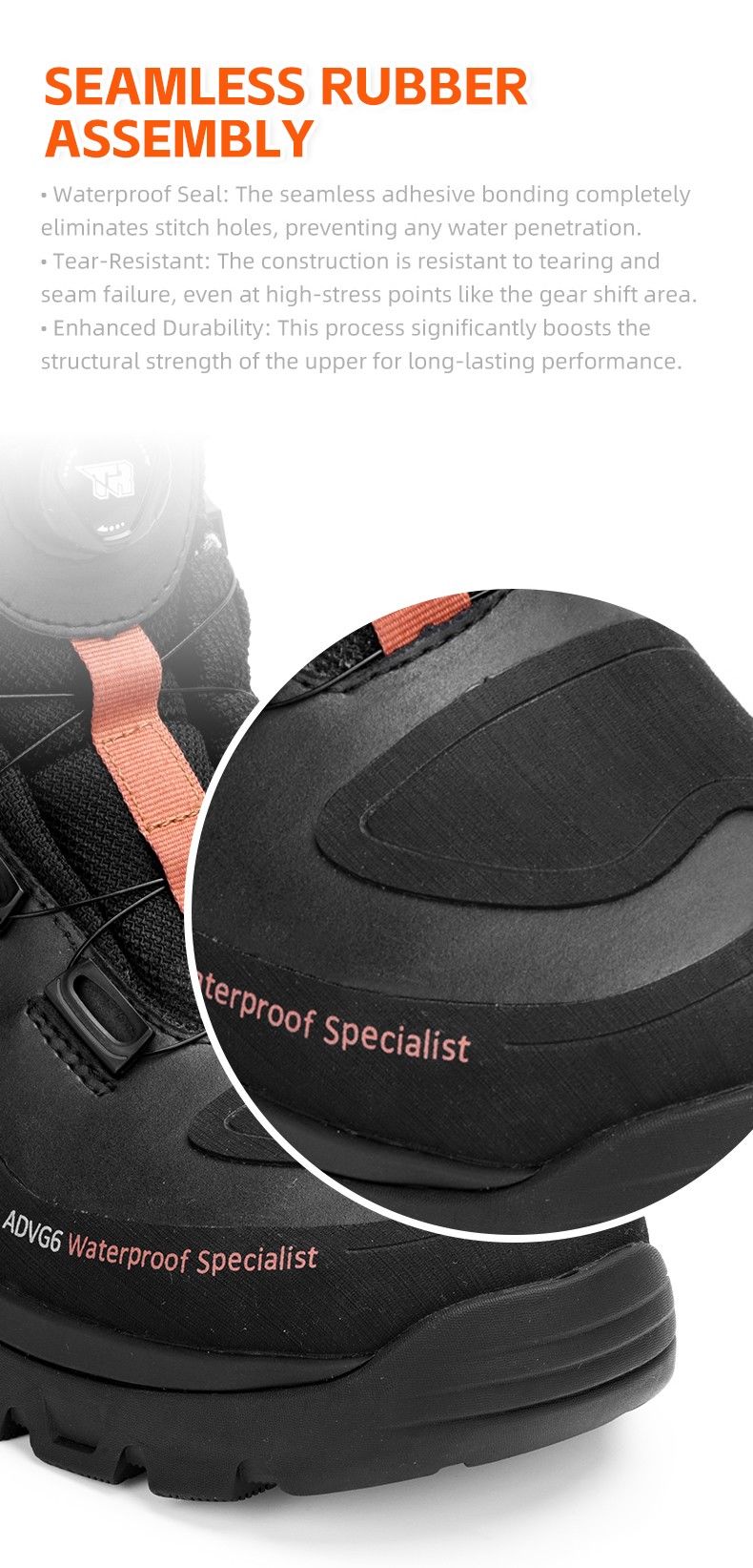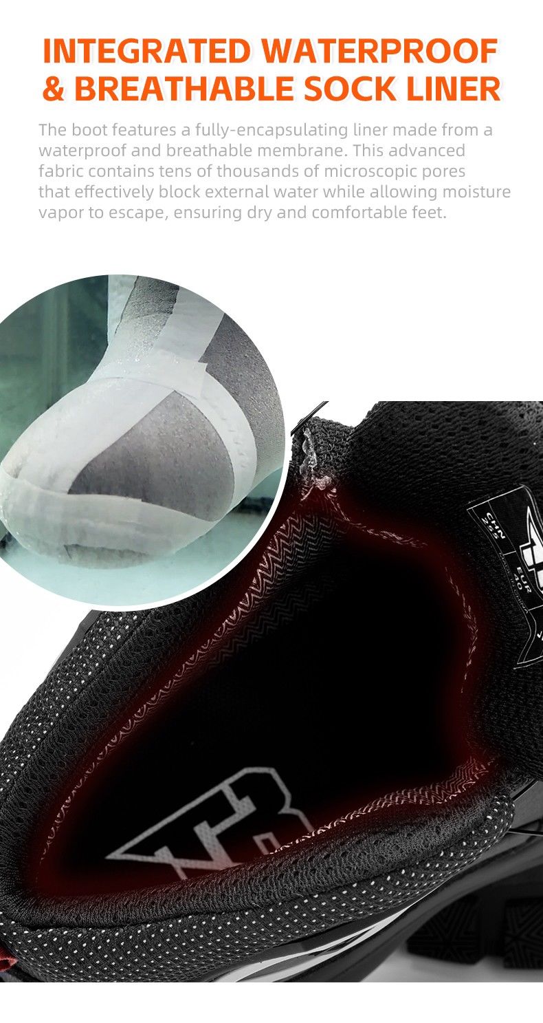 The boot features a fully-encapsulating liner made from a waterproof and breathable membrane. This advanced fabric contains tens of thousands of microscopic pores that effectively block external water while allowing moisture vapor to escape, ensuring dry and comfortable feet.